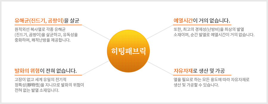 히팅패브릭은 독자적으로 개발한 카본 발열사로 면 또는 혼합사에 정교하게 코팅시켜 이에 생성된 발열사를 저온에서 고온(150℃)까지 자유롭게 온도설정을 할 수 있고 전기적 정특성을 지녀 탁월한 안정성과 내구성을 가지며 발열된 방사열은 원적외선 복사열을 다량 방출시켜 숯을 태우는 듯한 온열효과를 낼 수 있는 최첨단 발열 신소재입니다.